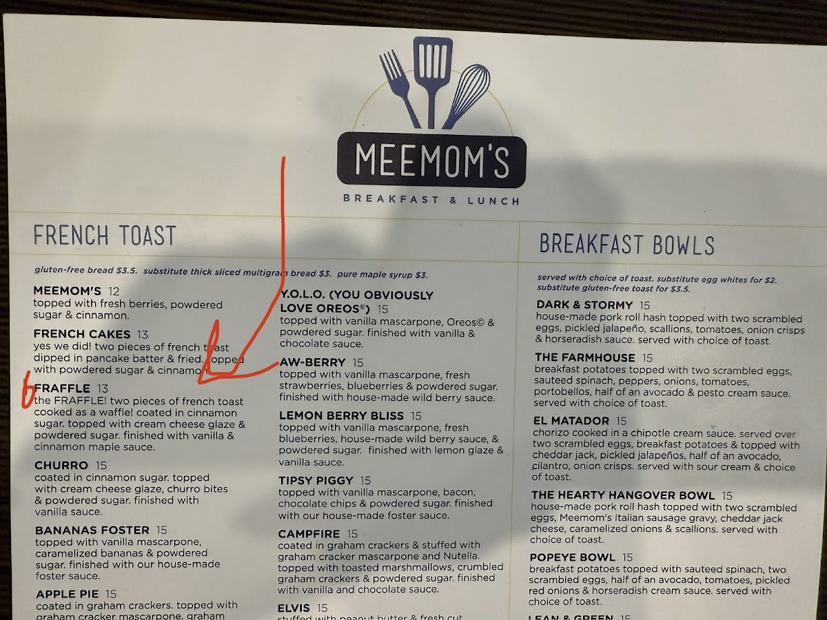 yes we did! two pieces of french toast dipped in pancake batter & fried. topped with powdered sugar & cinnamon.